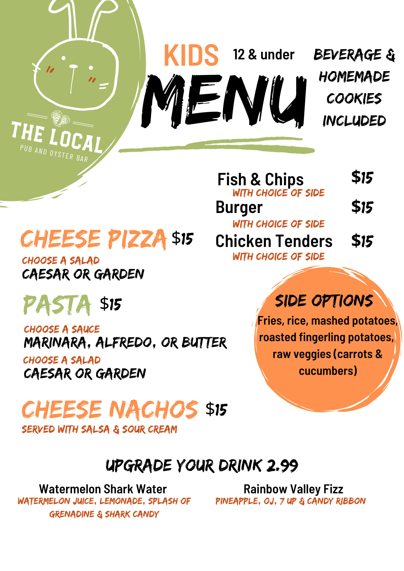 At The Local Pub & Oyster Bar, we’ve chosen our menu with local favorites from land and sea. We’ve made sure to include a great kids menu, daily lunch specials, as well as vegetarian and vegan options.
